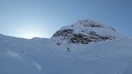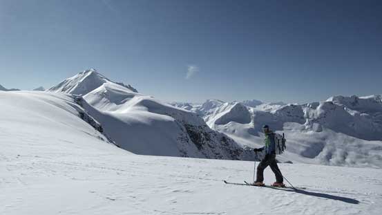 We were still able to follow a good set of skin tracks up the initial steep, icy and heavily crevassed section. The route cuts sharply climber’s left before veering gently right and eventually points more-or-less straight up towards the icefield. What surprised me was the amount of height gain that we still had to do. Lookout Mountain appeared to be “right there” but we still had about 500 meters of vertical to gain. At roughly elevation of 2100-2200 m we finally managed to gain the Neve and it was here that we finally hit some good snow.