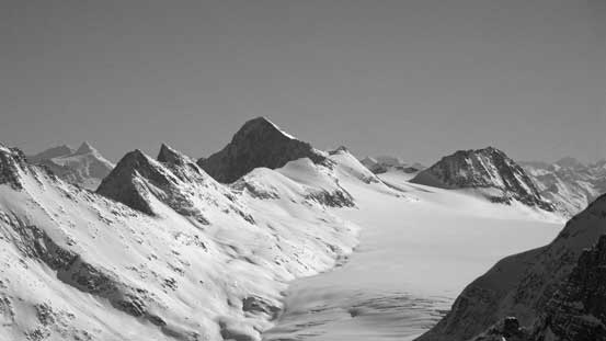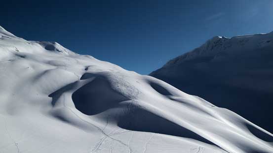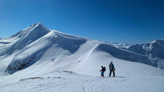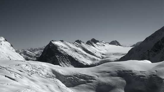 The connecting ridge from Lookout to Youngs up and over two unnamed bumps was one of the most scenic I’ve done, with the Illecillewaet on one side and the Asulkan area on the other. The ridge was technically very easy but took us for quite a while thank to the foreshortened view. We took our time here anyway as the weather was warm and sunny. Towards Youngs Peak we were all amazed by the gigantic cornices on its ridge.