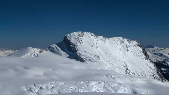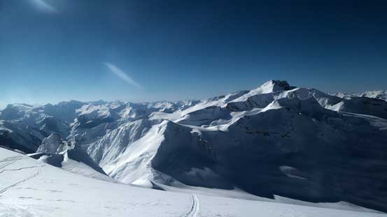 The tracks led us paralleling the base of Lookout Mountain and after another roll of height gain we arrived at the long, gentle, wide and glaciated connecting ridge between Lookout and Youngs. From here ascending Lookout Mountain is only a 20-minute round trip so it made no sense not to bag it..