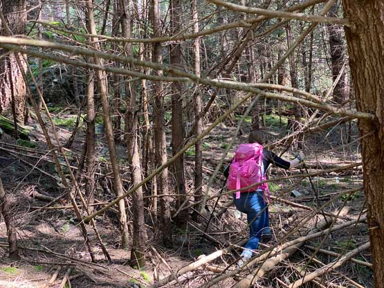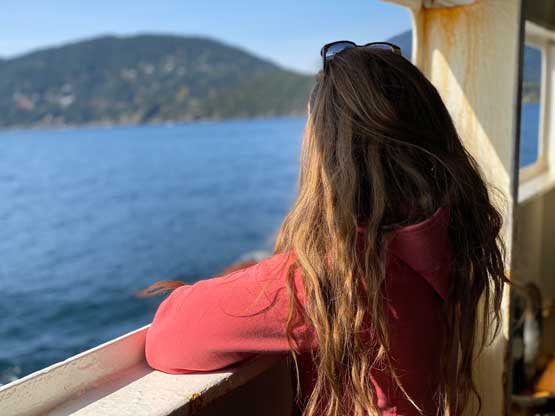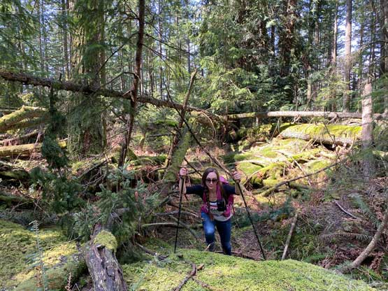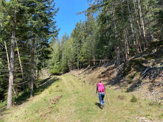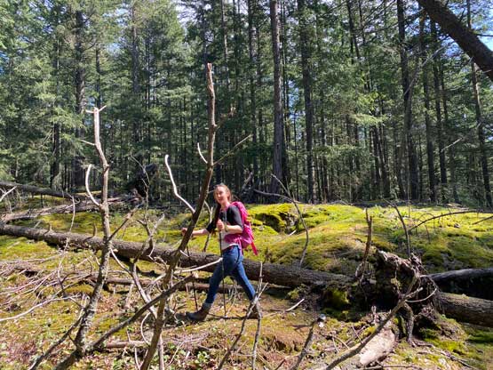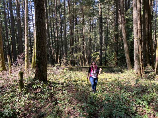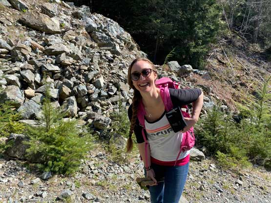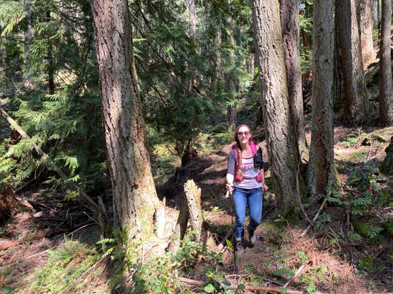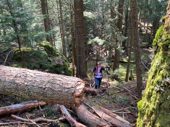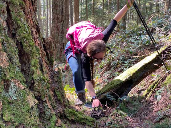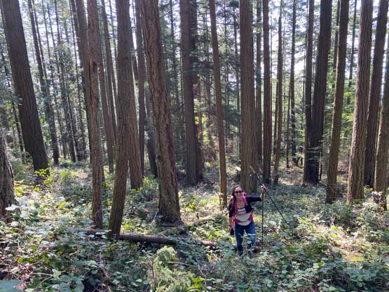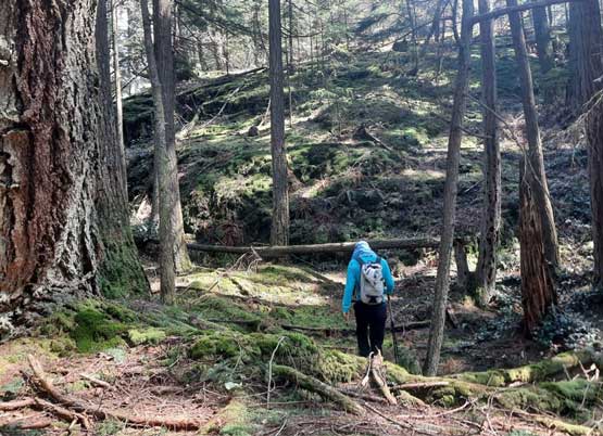 I had decided a number of years ago that the only way to bag “Apodaca Peak” was to squeeze it into that before-work category, but I did know the complication with ferry logistics and the rush hour traffics through Metro Vancouver could make this a challenging plan. Maria and I had been looking for a dumpster objective on Thursday morning and I immediately threw out this Apodaca thing. Ideally I would want to take one of the first few ferries onto the island to make sure we could definitely finish the hike by noon to take the 1:10 pm ride back to Horseshoe Bay, but Maria wasn’t able to leave Langley until 9 am in the morning meaning the only option for us was to take the 10:15 am ride to Bowen Island. Maria volunteered to drive to give me some extra hours of rest so that my afternoon/evening work wouldn’t be that miserable. After getting onto the island I used Gaia map to direct us to the south side of Apodaca Peak. The dirt road on the south side was not gated so we even drove a short ways up, but we did not have the best off-roading vehicle. After crawling through a rocky and overgrown stretch we immediately turned around and parked. At this point I sensed that we probably wouldn’t have enough time to hike and get back to the ferry terminal by 1 pm but whatever.