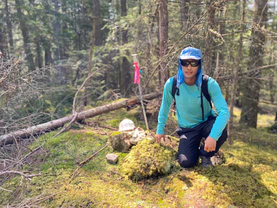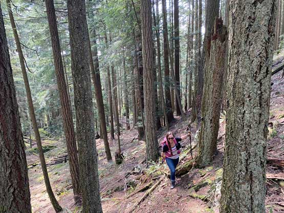 The gravel road was wide and open initially but quickly degraded a few switchbacks later. At one point I couldn’t even tell whether or not we were still following the road, so we bailed into the forest. I magically found some flagging and game trails so I essentially led us taking a pleasant short-cut. We intersected the gravel road higher up not far from the road’s end. We then officially bailed into the forest to start the bushwhacking. The going was mostly in open forest with some dead-falls and some underbrush that’s nothing beyond the “BW2” scale. What made things slightly more challenging than anticipated was the micro-terrain and the associated route-finding. It wasn’t that “go straight up” type of forest that is typical in the South Coast ranges. The terrain is actually more similar to Vancouver Island with small bluffs and gullies everywhere. The GPS had to be consulted at least 20 times on the ascent, and double that on the descent to make sure our bearing was correct. The top of the traverse to the true summit had a few dense bands of dead-falls and the view was non-existing anywhere along the hike.