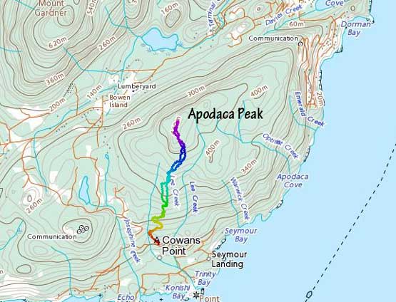 “Apodaca Peak” is the unofficial name of the highest point in Apodaca Provincial Park on the southern half of Bowen Island. This is one of the three peaks on Bowen Island that boasts over 300 m prominence. “Apodaca Peak” had been included in the Bagger Challenge list but they took it off in 2022. The rumor is that they decided the area needs some “conservation” but that’s not something I care to know about. Over the past several years the baggers had tried different routes on this peak. The most obvious attack is from the NW but the dirt roads (visible on satellite images and labelled on Gaia map) are blocked by private property signs with aggressive languages. Even if one dares to trespass the private property the bushwhacking on the upper NW flanks is reported to be character-building making this peak one of the worst “dumpster-dives” ever. Thankfully someone else explored a route from the south and reported on the Bagger Challenge forum. This southern approach has the least private property issues and the bushwhacking is not nearly as bad. The downside is the starting point being much farther meaning the bike ride from Snug Cove is longer and more tiring. However, if one does not mind to pay some extra cash to drive onto Bowen Island then this is definitely the best route, but the terms here are relative. An ascent of “Apodaca Peak” by ANY route is dumpster-diving, period…