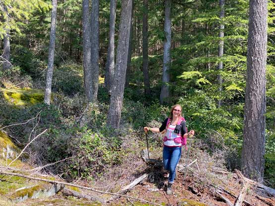 I had decided a number of years ago that the only way to bag “Apodaca Peak” was to squeeze it into that before-work category, but I did know the complication with ferry logistics and the rush hour traffics through Metro Vancouver could make this a challenging plan. Maria and I had been looking for a dumpster objective on Thursday morning and I immediately threw out this Apodaca thing. Ideally I would want to take one of the first few ferries onto the island to make sure we could definitely finish the hike by noon to take the 1:10 pm ride back to Horseshoe Bay, but Maria wasn’t able to leave Langley until 9 am in the morning meaning the only option for us was to take the 10:15 am ride to Bowen Island. Maria volunteered to drive to give me some extra hours of rest so that my afternoon/evening work wouldn’t be that miserable. After getting onto the island I used Gaia map to direct us to the south side of Apodaca Peak. The dirt road on the south side was not gated so we even drove a short ways up, but we did not have the best off-roading vehicle. After crawling through a rocky and overgrown stretch we immediately turned around and parked. At this point I sensed that we probably wouldn’t have enough time to hike and get back to the ferry terminal by 1 pm but whatever.