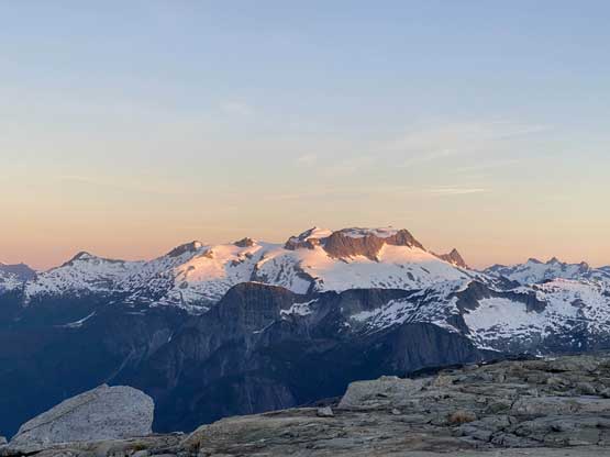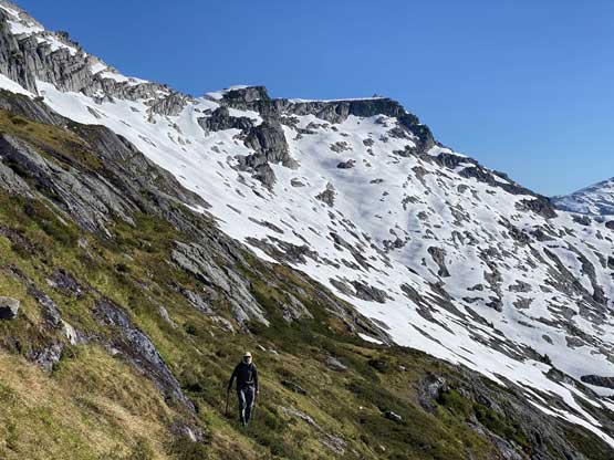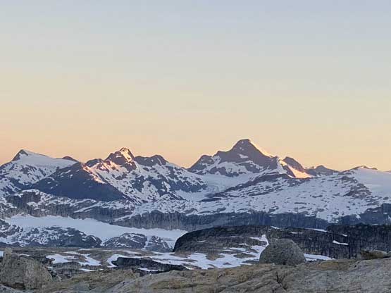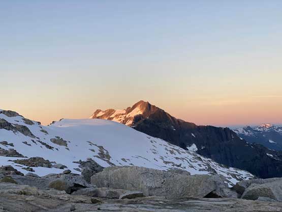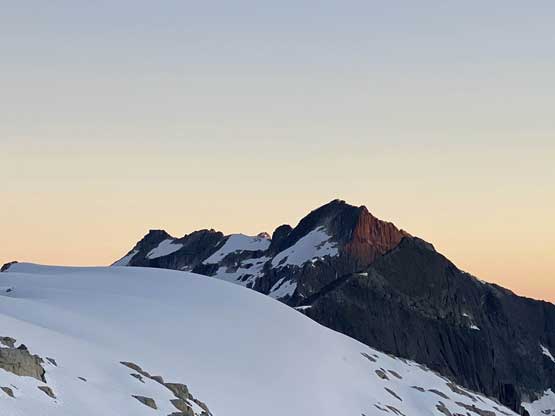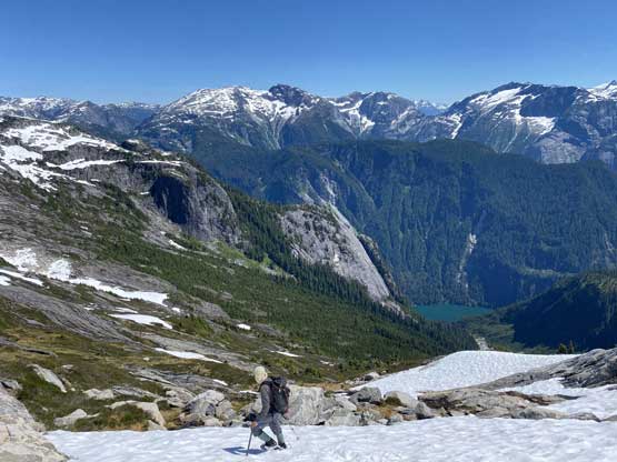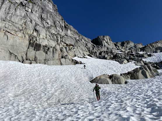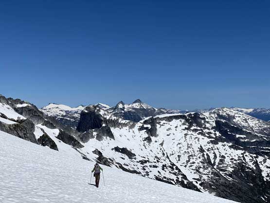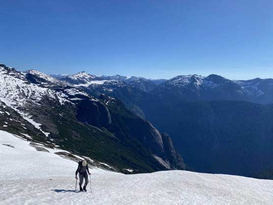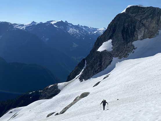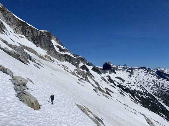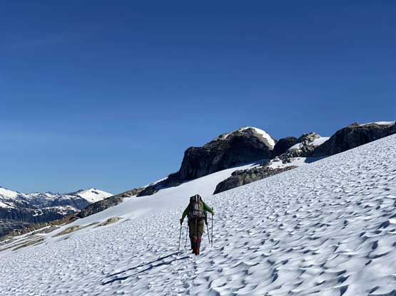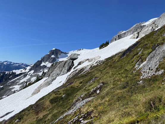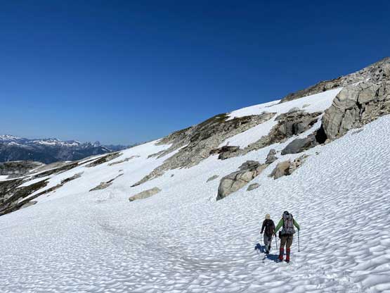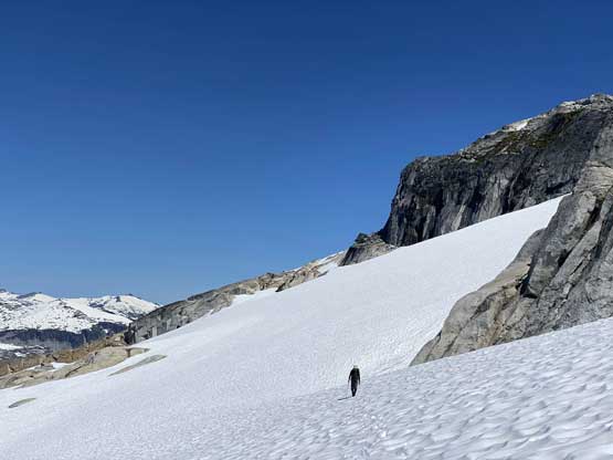 On Day 9 we woke up early but didn’t get going until way past sunrise. We were in a period of a record-breaking heat wave so even in the early morning hours we felt extremely hot and demotivating. From camp we walked several kilometers on easy terrain to the base of the NE Ridge. It’s clearly one could not find a non-technical route from this side so we resumed our proposed plan. We had some trouble finding a way dropping down to the east side of Mt. Pearkes but after backtracking 50 meters we found a nice class-2 ramp that led down. Most of the traverse across the east face of Mt. Pearkes was done on snow, but some parts had already melted out down to grass and rocks, but the angle was low enough that the scrambling was easy. There were plenty of water sources so we all drank a lot. The east face traversing section felt never-ending and super tedious with lots of up-and-downs in the micro-terrain.