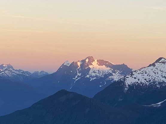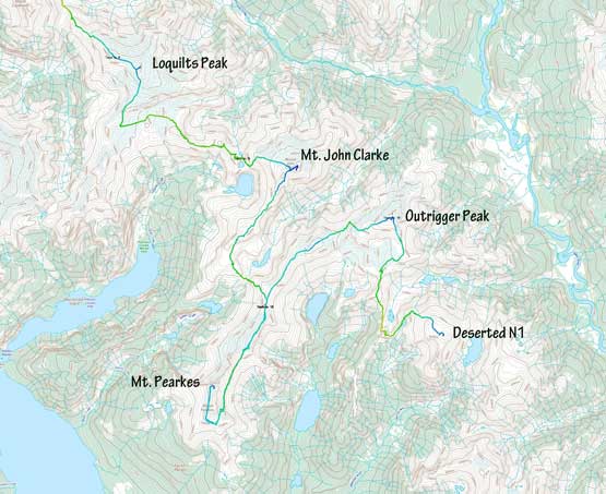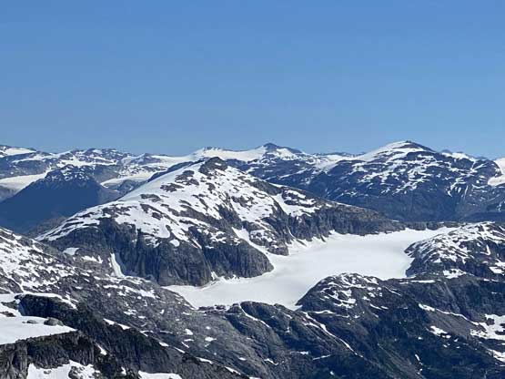 This peak was not part of the agenda when Alex, Vlad and I planned the 10-day traverse from Clendinning Range towards Jervis/Elaho divide but after summitting Mt. John Clarke on Day 8 we changed the plan. We abandoned the original plan to traverse to Ashlu Mountain and opted to spend an extra day exploring Mt. Pearkes. None of us had done any research and in retrospect, an internet research of this peak would returned nothing useful so we might as well skip that part. I did however, downloaded and saved the satellite images of this peak onto my Gaia GPS app. I also took several photos of the east side of Mt. Pearkes on our flight to Mt. Willson so combining what we had and our experience in mapping a route out based on solely satellite images and topographic maps we did manage to propose a roundabout route that might work as a walk-up on mostly snow. The proposed route is accessed from the north side as we came from Mt. John Clarke, and traverses across the east, south and then west faces on low-angled snow or rock/heather ledges to the very top part of the NW Ridge, which is then followed to the summit.