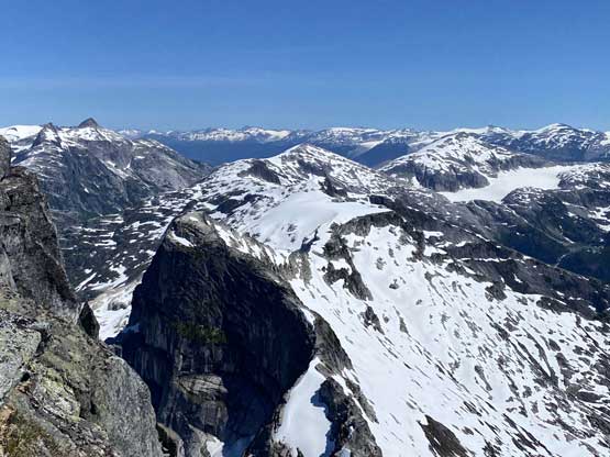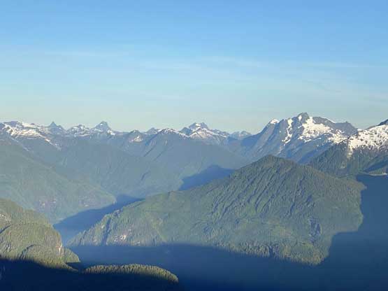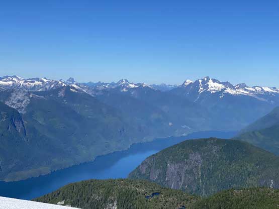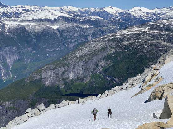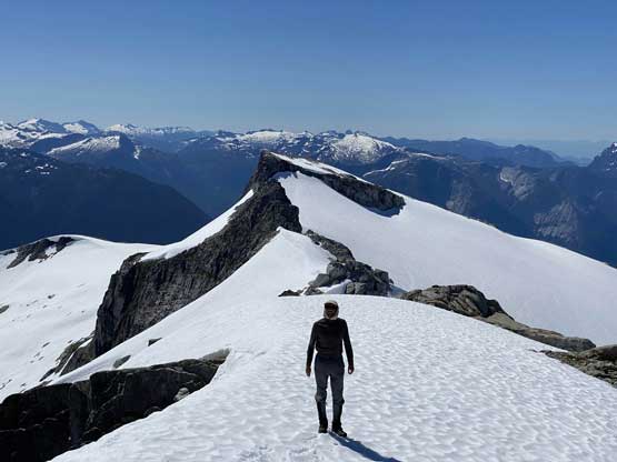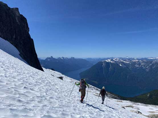Eventually we reached a notch/col on the SE Ridge and easily hopped over to the south side overlooking Jervis Inlet. We spent half an hour admiring this rarely, if ever seen view of the inlet and the north face of Mt. Churchill before resuming the traverse across the short south face. This section had no difficulty but did require some route-finding. In short time we had hopped over the SW Ridge onto the upper west face of Mt. Pearkes. The traverse across the west face towards the NW Ridge was mostly easy and low-angled snow such that we managed to cover the terrain in a timely manner.