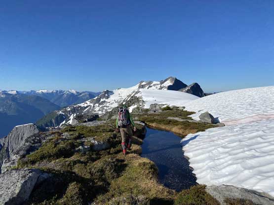 On Day 9 we woke up early but didn’t get going until way past sunrise. We were in a period of a record-breaking heat wave so even in the early morning hours we felt extremely hot and demotivating. From camp we walked several kilometers on easy terrain to the base of the NE Ridge. It’s clearly one could not find a non-technical route from this side so we resumed our proposed plan. We had some trouble finding a way dropping down to the east side of Mt. Pearkes but after backtracking 50 meters we found a nice class-2 ramp that led down. Most of the traverse across the east face of Mt. Pearkes was done on snow, but some parts had already melted out down to grass and rocks, but the angle was low enough that the scrambling was easy. There were plenty of water sources so we all drank a lot. The east face traversing section felt never-ending and super tedious with lots of up-and-downs in the micro-terrain.