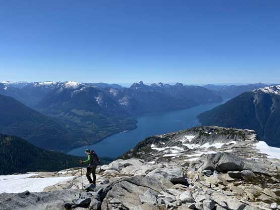 Eventually we reached a notch/col on the SE Ridge and easily hopped over to the south side overlooking Jervis Inlet. We spent half an hour admiring this rarely, if ever seen view of the inlet and the north face of Mt. Churchill before resuming the traverse across the short south face. This section had no difficulty but did require some route-finding. In short time we had hopped over the SW Ridge onto the upper west face of Mt. Pearkes. The traverse across the west face towards the NW Ridge was mostly easy and low-angled snow such that we managed to cover the terrain in a timely manner.