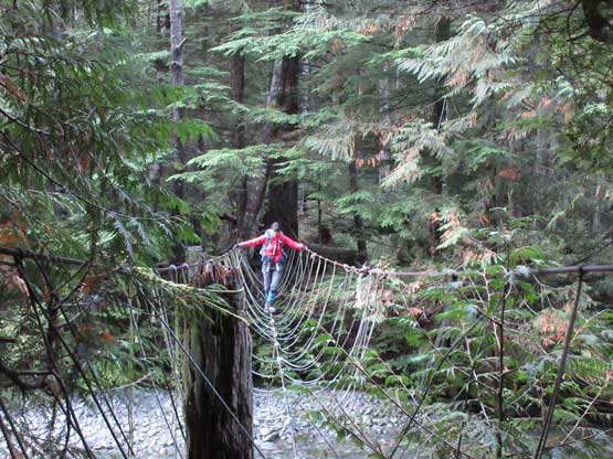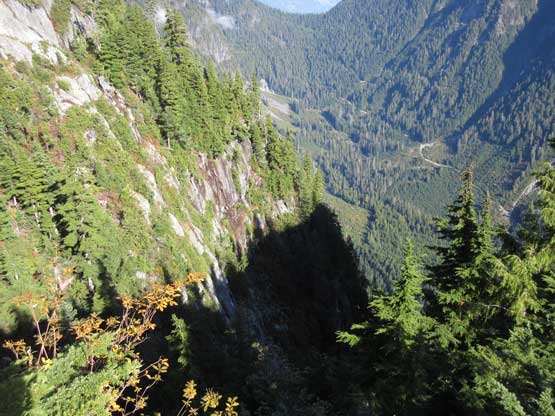 The next morning we got up at around 6:00 am and drove back towards the factory after it’s “bright enough”. The same gate keeper gave us permission this time. The drive up Rainy FSR wasn’t as “2WD” as what others reported. The road wasn’t terribly steep, but narrow and very rough at places with lots of rocks to crawl over. For once again I was glad to have a Tacoma for tasks like this. The trail-head was correctly located with the aid of my Gaia GPS app and the parking was at a small pull out about 50 m farther up the road. The trail was easier to follow than I was expecting and after a short bit of descending we reached that infamous three-wire bridge. The bridge crossing over Rainy River was a little freaky but nonetheless we both made across with no mishap. The trail then continues along an overgrown logging road before branching off into the woods. This critical junction marks where “Rainy Mtn. Trail” branches off from the main “Tetrahedron Trail”. The lower portion of this trail switchbacks up the secondary growth forest to a small waterfall, before ascending steeply straight up on a hogback feature. There were a lot of ribbons anywhere along the trail.