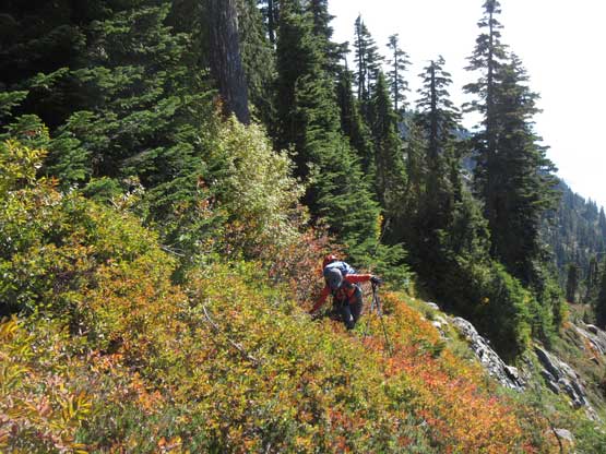 Ascending the upper portion of Rainy Trail. It was very overgrown