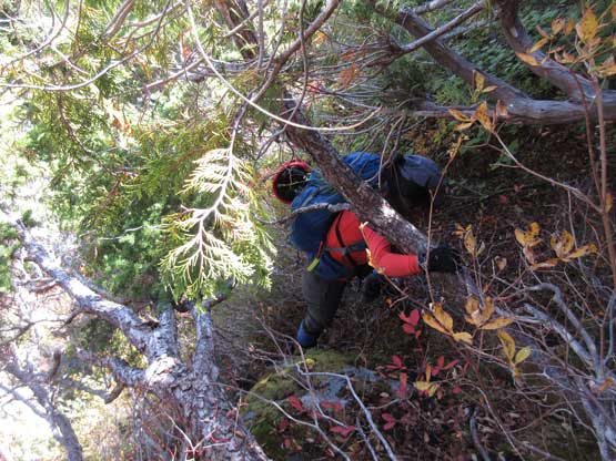 At the col I finally decided to switch footwear donning Trango Towers because the trail-runners performed terribly on steep grassy slopes. The E. Ridge of Tetrahedron Peak would be mainly bush thrashing with some 3rd class scrambling. The ridge started off easily but only for a short moment. Not far up we got our taste on the thrashing and it soon became full-on. I didn’t know whether or not we had picked the easiest line but the route sucked balls.. For a long while the game was almost vertical pulling-up using pure arm strength. Fighting through the tight branches wasn’t easy neither.
