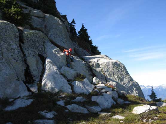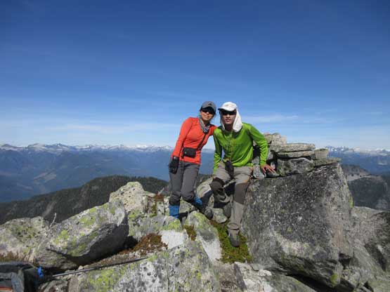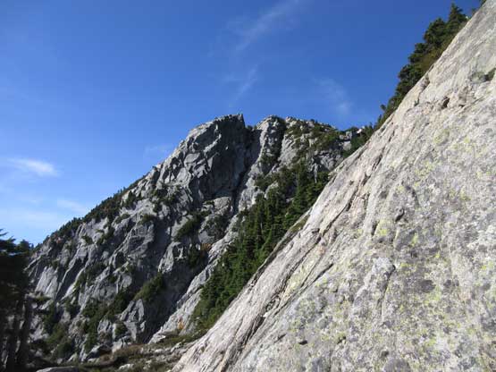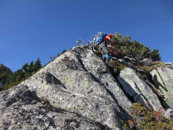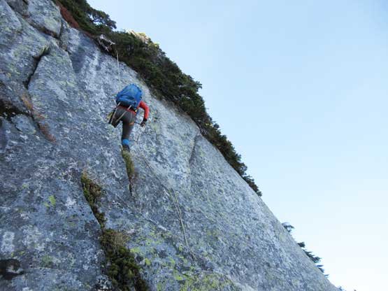 About halfway up the face/ridge the terrain eased off a bit. The bush was temporarily replaced by 3rd class bluffs requiring some careful route-finding. The steep granite faces forced us farther out climber’s left onto some narrow ledges and then there came more bush thrashing. And then we ascended an exposed pitch of “class 3” on down-sloping ledges. The last section was actually quite easy and we checked off both summits just to be sure. It turned out that the first (east) summit was the highest one, and the views were far-reaching, as expected.
