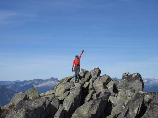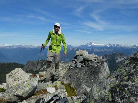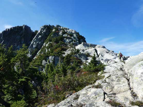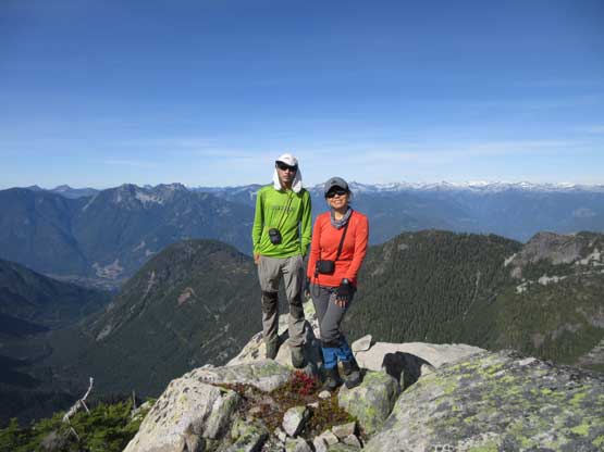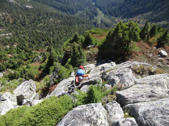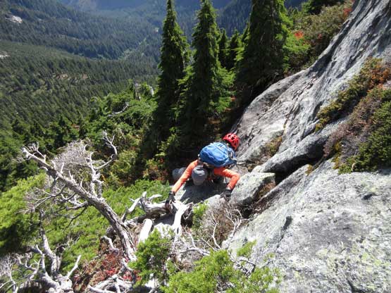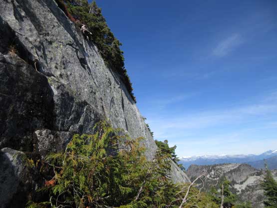 About halfway up the face/ridge the terrain eased off a bit. The bush was temporarily replaced by 3rd class bluffs requiring some careful route-finding. The steep granite faces forced us farther out climber’s left onto some narrow ledges and then there came more bush thrashing. And then we ascended an exposed pitch of “class 3” on down-sloping ledges. The last section was actually quite easy and we checked off both summits just to be sure. It turned out that the first (east) summit was the highest one, and the views were far-reaching, as expected.