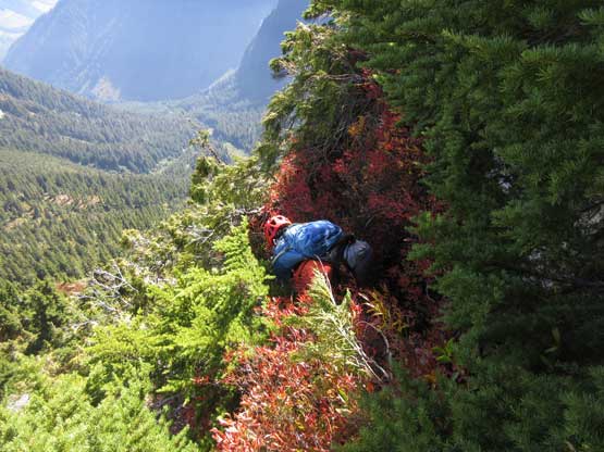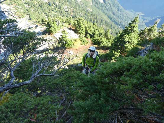 On the ascent I had thought about descending the SW Ridge straight down into the valley but realized I had ditched the trail-runners along with a pole at the col… The trail-runners were pretty beaten but I did care about the pricey carbon fibre pole.. On the good side we had brought a 30-m rope along with harnesses so the aim was to skip as much as bush thrashing as possible by making rappels off bluffs. I have to say that bringing a rope was a smart idea. On this type of unknown BC 3rd class bluffy terrain it’s always a good idea to have some backup plans. We did three rappels and the descent was overall not the worst of nightmare. It was still a miserable thrashing game and far from something I would recommend. The second rappel was the most memorable as we literally rapped a line through trees…