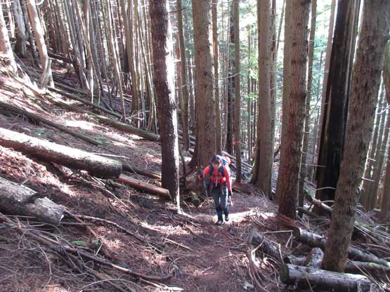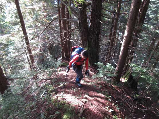 Ascending the upper portion of Rainy Trail. It was very overgrown