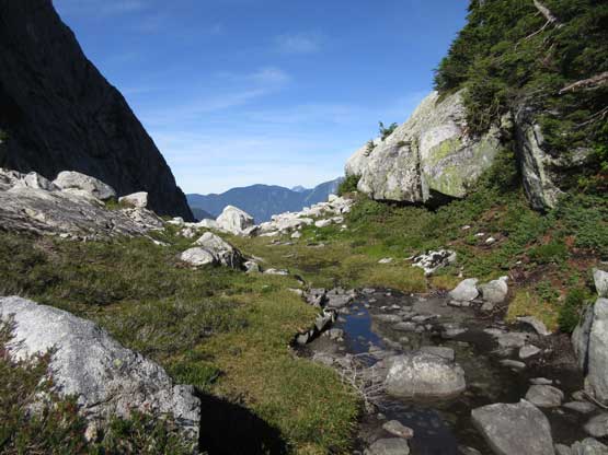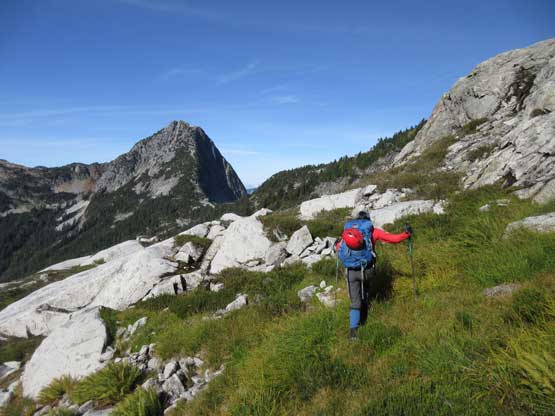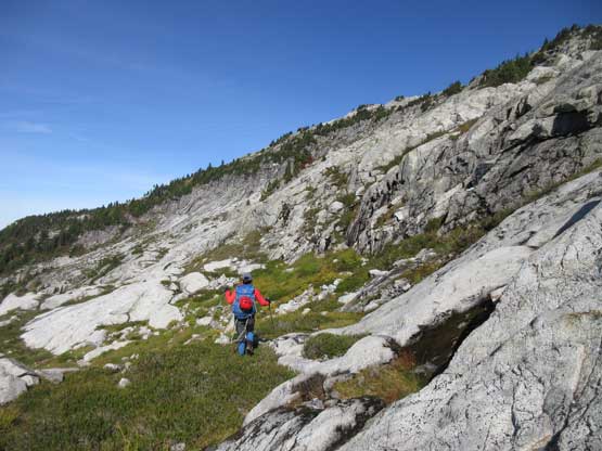 At roughly elevation of 900 m the trail ascends into the blueberry brushes. The brushes were extremely wet from the previous days’ rain and the morning dew. There’s no break in this overgrown bashing and at times we felt like “bushwhacking” even though we were following a clearly-marked trail. The abundance of ribbons meant staying on trail was not difficult, but staying dry was impossible. In no time we were both soaked to the bone. The upside was the juicy berries. It was the berries that kept our stoke level high but honestly speaking the hike was miserable to say the least. Eventually we broke out of the forest at a “slab town” greeted by the warm sunbeams. The general bearing was trending a little bit climber’s left aiming at the skyline ridge. I thought we were on our own here but soon enough we picked up ribbons and cairns again. The “trail” continues into the alpine and onto the E. Ridge of Rainy Mountain. We ascended the ridge for a long while before making a long, horizontal traverse over to the south ridge. Our decision was to traverse an “obvious bench” under Rainy Mountain to Rainy/Tetrahedron col so there’s no need to ascend too high here.