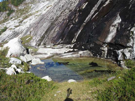Around a corner on the south ridge of Rainy Mountain we finally had our eyes on the first objective – Tetrahedron Peak and its East Ridge. The “bench traverse” across Rainy Mtn.’s SW Face was the experimental part but appeared fairly trivial with only minor route-finding issues. Much of this traverse was done on gigantic granite slabs intermittent by some bushes. The worst was near the end. Apparently we ascended too high and had to lose about 100 m down into Rainy/Tetrahedron col. This part sucked with lots of steep heather slopes and bushwhacking.