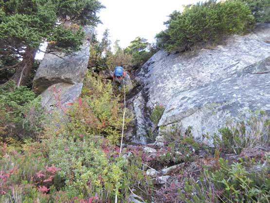 Lily scrambling up a wet, 3rd ramp on the upper mountain