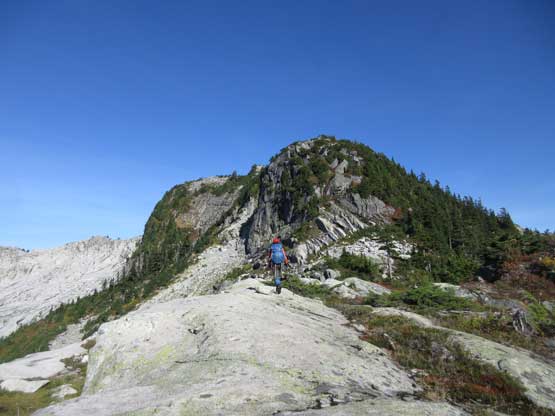 Lily arriving at a low col on Rainy’s South Ridge, with Mt. Varley behind