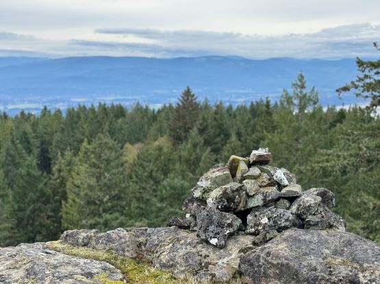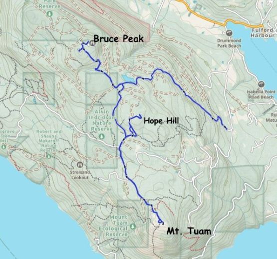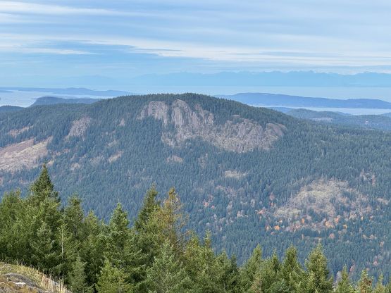 Bruce Peak is the highest peak on Salt Spring Island and subsequently boasts over 700 m prominence. Mt. Tuam and Hope Hill are on the same forested massif but only the former has over 100 m prominence, even though both are officially named. There’s minimal hiking involved for all three objectives if one owns a trusty 4×4 vehicle so there’s minimal mountaineering value in these. Clair was rather staying in the hotel working on her homework and projects after tagging Baynes Peak in the morning, but I was determined to tag as many pimples as possible.