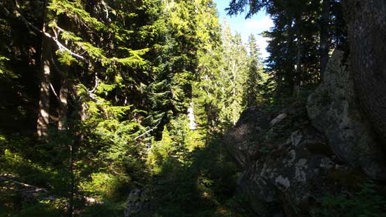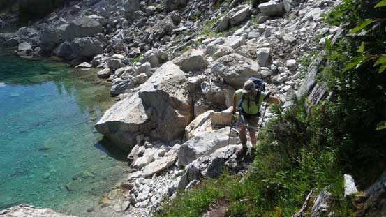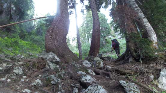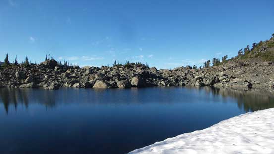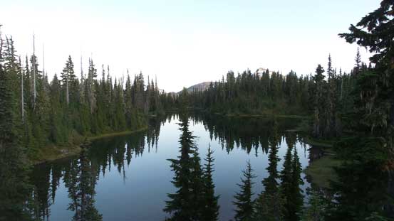 Back to camp I was totally beat but the good news, none of us was in the mood of moving camp. That meant we could have a pretty relaxed evening but then the 4th day would be a long death-march all the way back to the parking lot. The deal was made and then sleep came fairly easily although the temperature was still hot. The morning of Day 4 saw us departing at just after sunrise. Right off the bat we had to face that 300-meter descent to Schjelderup Lake which got our knees a good work out. And then there came the two consecutive unpleasant lake shore traverses, another 50 meters of plunge down Carter Lake’s outflow and then the 300-meter forested slog back to the 1350-meter saddle. Thank to the “alpine start” we had the pleasure to do this whole stage in the absence of sun beams.