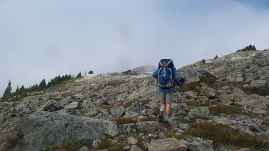 The next morning saw us waking up a bit later than planed but there’s no need to rush. The problem arose sooner than expected as a layer of low clouds rolled in and in no time we were in a complete white-out. There’s even some light drizzle which made lots of four-letter words flying around, mostly to curse the weather forecasters. But then we could see the ceiling layer was thin and there’s blue skies around so there’s little to worry about. The theme of up-and-downs had already started as soon as we got to the treeline zone of Phillips Ridge. I had lost count how many bumps we had to ascend up and over. The good thing we did not have to ascend the two highest bumps on Phillips Ridge’s alpine. To claim that summit we’d simply tag them on the return but right now let’s push as far as possible.