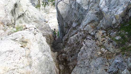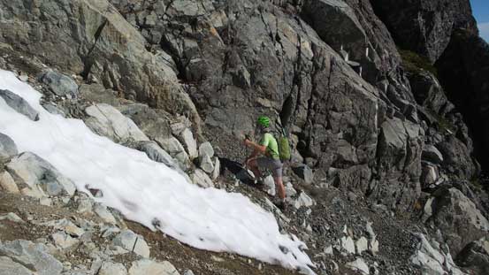 Eventually we had to go down. It’s hard to leave this summit but let’s face it. The plan was again, Adam and I descending roughly half an hour ahead of the other group so that the rockfall hazard was minimized. Reversing the loose gully was tamely easy as we could just (sort of) scree ski down the middle of the fall line. Back to the snow field, I didn’t fuck around with the gears this time, donned crampons and then down-climbed the entire path facing inwards. The snow surface was homogeneous which made a very enjoyable process. Only a few kicks got me into the rhythm I wanted. Adam played more cautiously but joined me soon afterwards. The gear transition took a couple more minutes and then the next thing we were down to the bottom of this SE Gully, and then easily reversed the lower SE Face. To locate the lower couloir I pulled the GPS out because we descended too low and missed the path.