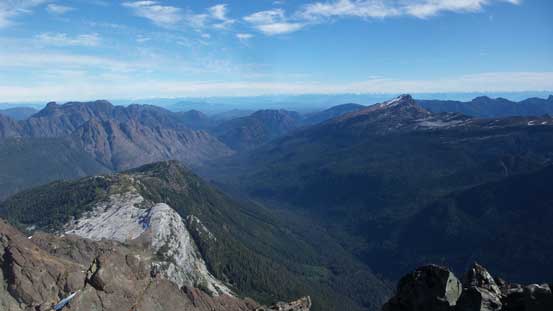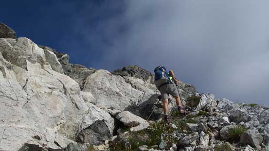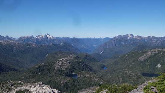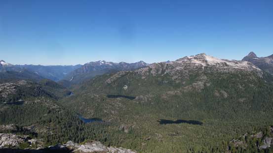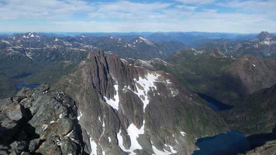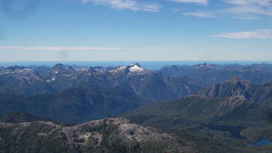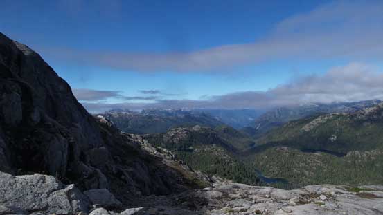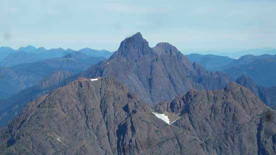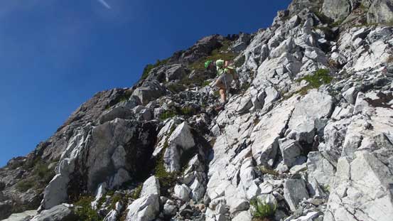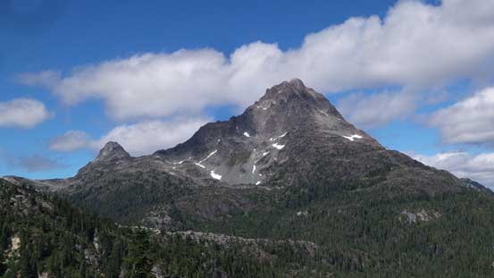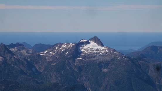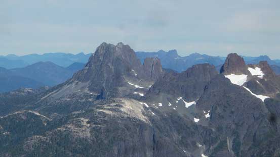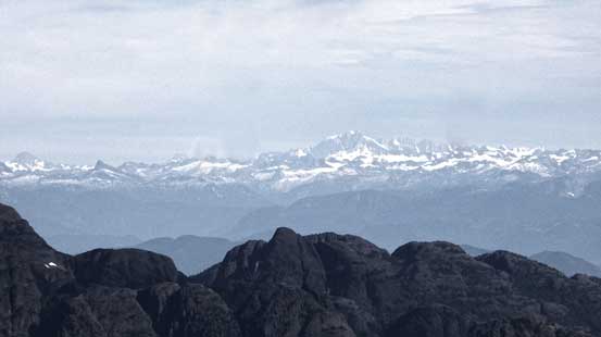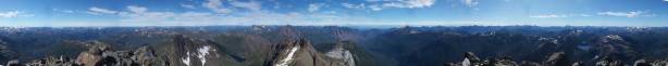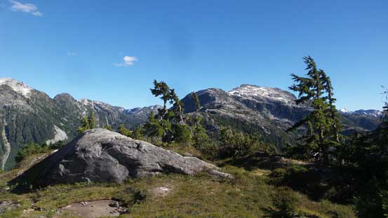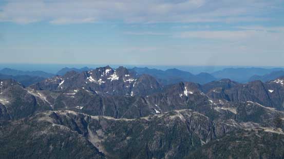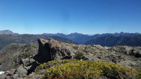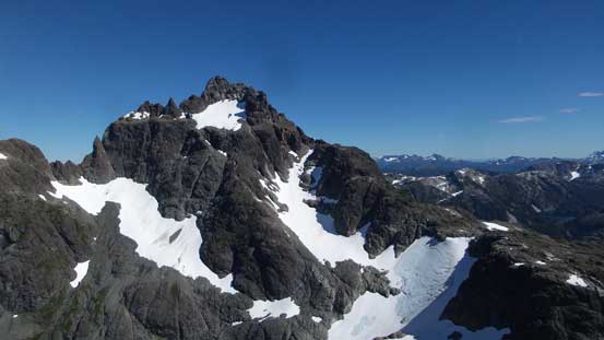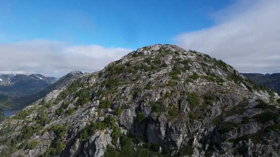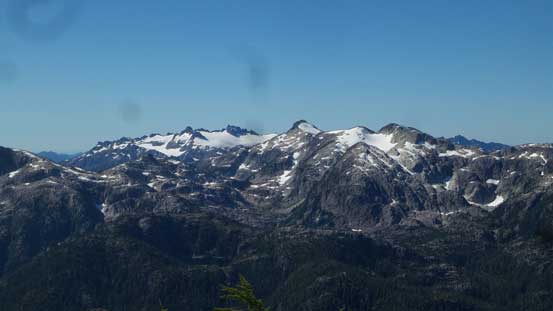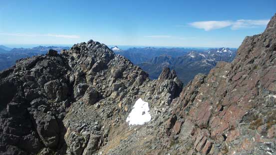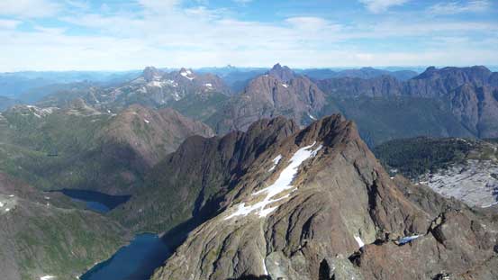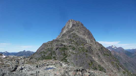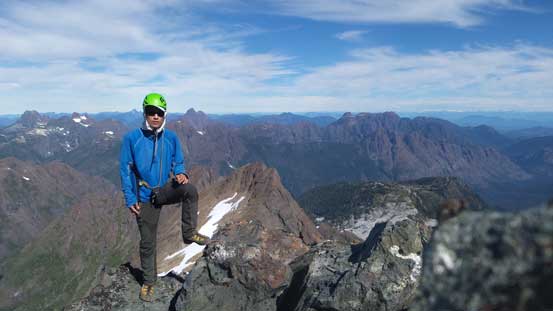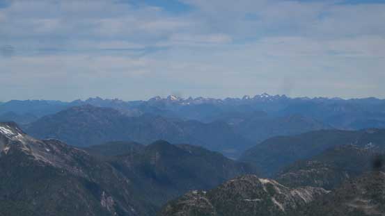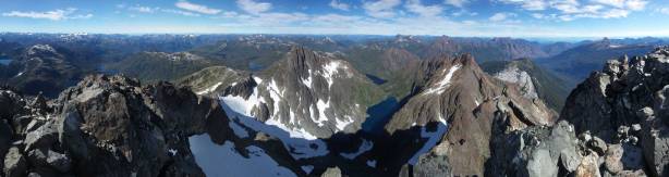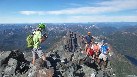 The pitch of snow was overall short-lived and then we were back onto rock. There’s nothing overly fancy in the upper gully although the ground was quite loose in general. The scrambling was however, “low 3rd class” at its hardest and before long we were at the top of this SE Gully looking down the north side. Then turning right following paths and cairns we had a leisure walk to the highest point. The scrambling was disappointing. The views were as expected, million-dollar towards each direction especially with the mighty Mt. Waddington visible on the skyline. About 40 minutes later the other group showed up and then it’s party time on the summit.