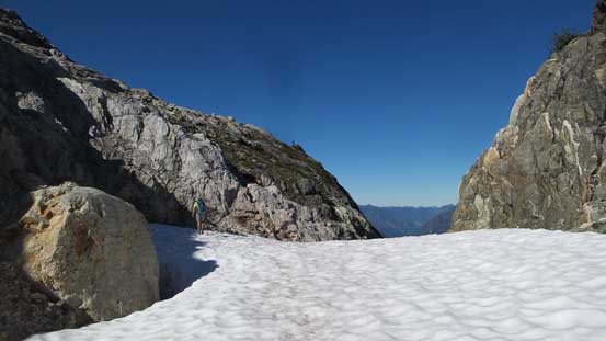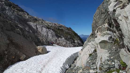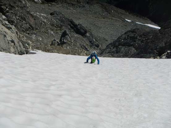 The gully was much easier than expected with scrambling difficulties not exceeding “low 3rd class” until we hit a (permanent) patch of steep snow. This pitch of snow was about 50 meters long and ran at 40-45 degrees ish at the steepest. Most parties including our reference trip report did a detour on climber’s right side. With good route-finding skills one can stay within “low class 4” terrain but as mountaineers we figured the easiest option was simply ascending the middle of this snow field. This snow climb looked tamely easy to me. I did take out the axe but didn’t bother to don crampons, but after 2/3 of the way up I regretted for not using the crampons. For the last 20 meters I had to kick multiple times as the snow was hardpacked and icy, and meanwhile the exposure was pretty real.