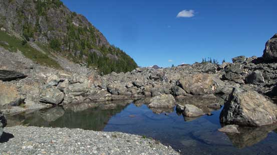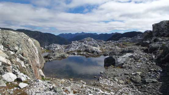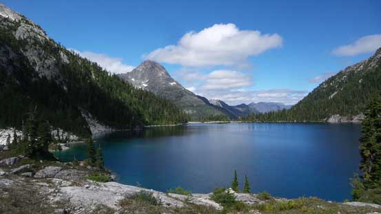 The next stage was traversing the west shoreline of Carter Lake and believe or not, this section was also easier than expected due to the lack of bushwhacking. There’s a good trail for most of the way but we lost it towards the end. The punishment was some unpleasant side-hilling but nothing’s terrible and we soon rejoined the trail at the rear end of this lake. The trail then led us ascending the gentle grassy slopes due NW to a small, unnamed lake below the impressive east face of Mt. Burman. We did no lingering but immediately carried on, crossing over a divide and then we saw the larger, but prettier Schjelderup Lake. Descending and then traversing the west shore of Schjelderup Lake was more difficult than Carter Lake but again, the lack of bushwhacking made it a fairly tame undertake. The only downside was now we had to deal with a fair amount of tedious boulder hoping along with at least two major up-and-downs.