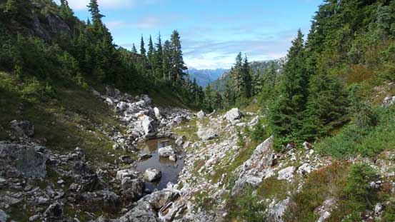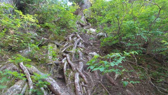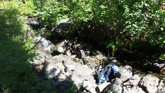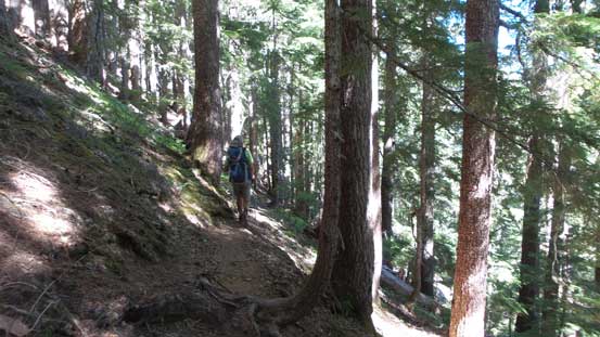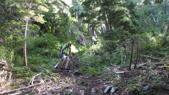 Towards the end of this Phillips Ridge traverse the ridge crest turned a more northwards direction and it was here that the terrain became super rugged. Right off the bat we lost the trail and then had to down-climb a 3rd class chimney. We rejoined the trail lower down and then did a long descent into a “waterfall chasm” before regaining all of the lost elevation back up to the next bump. And then three consecutive bumps followed in a sequence and it sure didn’t disappoint us, as we had to ascend up and over all of them and then drop down into a broad, 1350-meter saddle. Two routes split up here and the nowadays standard option descends the steep forest all the way to about 50 meters below the surface of Carter Lake. The only positive thing – there’s no bushwhack whatsoever thank to the popularity of this objective. The place where we crossed the outflow of Carter Lake was a good spot to take a long break and after that we carried on to the shoreline of Carter Lake where at least three tents were pitched.