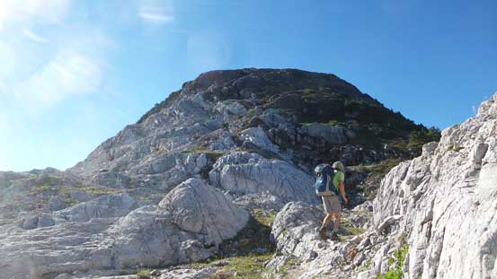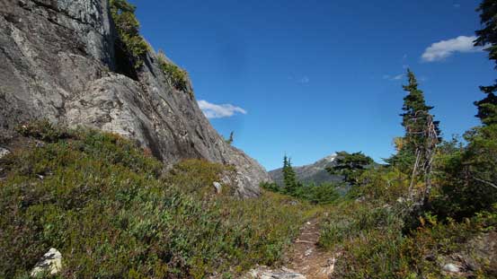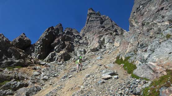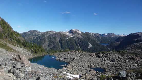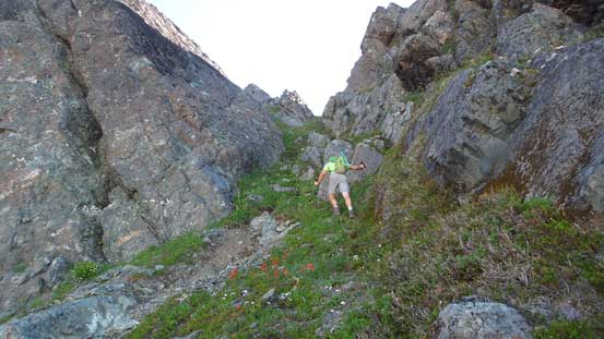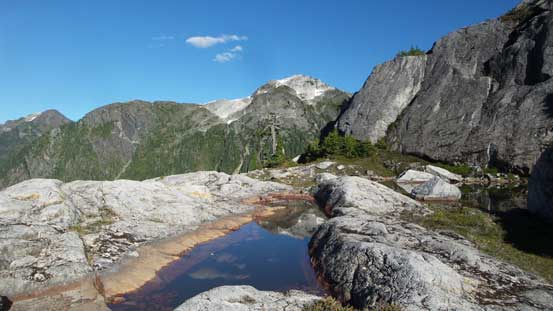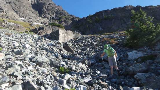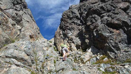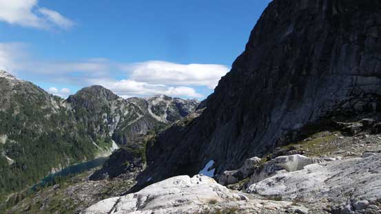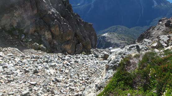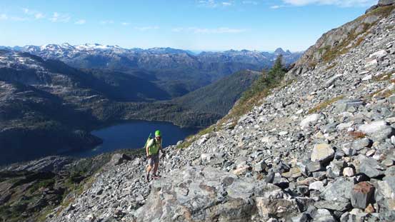 At this point Adam wanted to just head back to camp but I was still very keen on trying The Behinde so we departed from each other with me side-hilling across the entire lower south face, aiming for the distant Behinide/Golden Hinde saddle. The solo ascent of The Behinde turned out to be the scrambling highlight of this trip with sections up to 4th class and super exposed. A few hours later I was back at the “climber’s tarn”, picked up the trail and then descended into “Burman Chasm” at perhaps the most leisurely pace ever. The temperature and humidity was brutal on this day plus I was running low on water. Re-ascending out of the “Burman Chasm” back to camp felt like the most dreary 400-meter ever but at least the views were improving in the later afternoon sunbeams.
