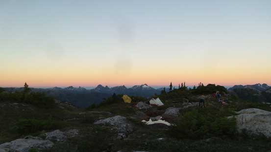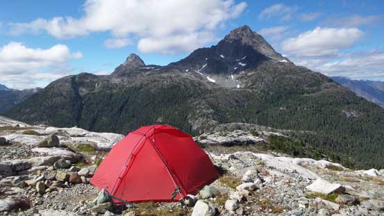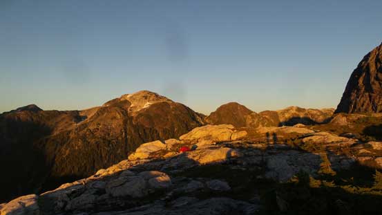 After a short break we resumed the approach, picking up the trail again heading upwards into the forest. The next stage was a near-300-meter grunt to the crest of “Burman Ridge” and needless to say, this is not a stage that any of us was looking forward to, especially at this time of a day. The grunt was however, easier than expected probably due to the fact we now had a head-on view of the south face of Golden Hinde and also The Behinde. Having the main objectives in sight definitely helped boosting our motivation. According to the others this “Burman Ridge” was the last 5-star campsite so we had some discussion. My original plan was to push all the way to the “climber’s tarn” below the south face of Golden Hinde but here I changed my mind. The new plan was to set up camp and then bag Mt. Burman in the evening of this day as it’s right here and made sense. This turned out to be an excellent plan. The other groups – four kind and helpful locals, also pitched their tents at this “Burman Ridge” camp site and we all enjoyed a spectacular sunset.