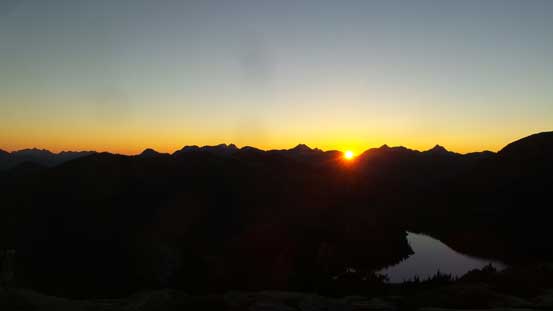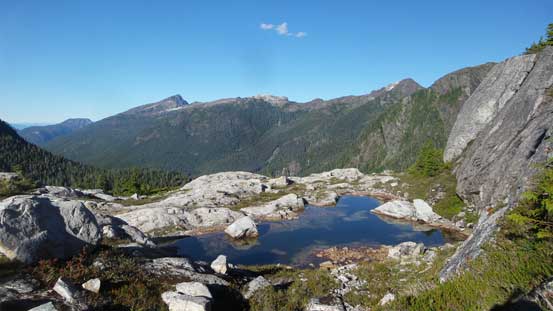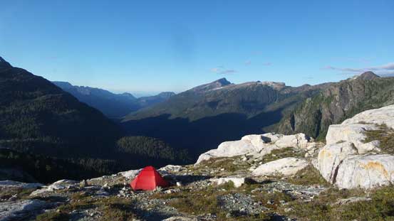 Towards the last minute we decided to extend the trip by one day and in particular we would knock off the initial 5 km Arnica Lake approach in the evening of Day 1. This would shorten our main approach day by at least a couple hours. To make full use of that day we did a detour into the city of Victoria and then did a short hike up Mt. Douglas. By the time we finally got to the trail-head in the hours of late afternoon it was a bit of tough going at the start. The temperature was hot, the air was humid and there’s at least a hundred mosquitoes around. It’s very tempting to get lazy but that’s not the right spirit so we just sucked it up. After an hour into the game the tiredness had eased away and then we had a cruise sailing up the endless switchbacks. The elevation of Arnica Lake was more than 1000 vertical meters above the parking lot. There’s a couple empty (and excellent) tent pads but I said let’s keep pushing further. Carrying on up onto the lower reach of Phillips Ridge we eventually settled beside an empty tarn near a 1400-meter plateau.