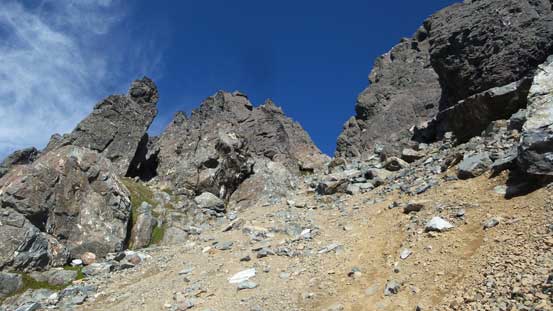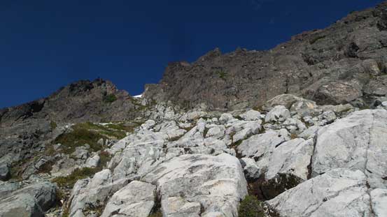 Once out of the chasm we entered a zone of sparsely forested granite steps and the going was fairly simple. For a long while we could still follow the trail/path which eventually led us to the “climber’s tarn”, albeit after a long section of grunt. The tarn was indeed, much less pleasant for camping as the shoreline was just steep boulders with little place to pitch out a tent. Upwards again we initially ascended on snow but soon merged onto scree. The obvious path led up trending slightly climber’s right and eventually into a gully feature. Ascending this narrow gully/couloir was pretty straightforward and then we were dumped on the edge of SE Face. From there we had to do a diagonal rising traverse to the base of “SE Gullies” but this stage was the worst. Rockies type of treadmill scree punished us and to push through the shitty terrain required lots of perseverance. Eventually the looseness eased and then we saw a strip of white rocks coming down from the uphill side. And here we go, this is the correct start of SE Gully.