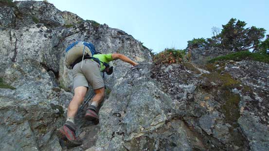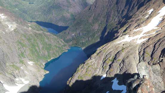 On the morning of Day 3 Adam and I woke up around sunrise. The sky was perfectly clear so this was THE DAY.. The other group had planned to start an hour later and our strategy was to minimize the time spent in that loose SE couloir together as a group-of-six would be too much for rockfall hazard. The day started by a very frustrating 400-meter elevation loss down to the outflow of Burman Lake aka. the “Burman Chasm”. Ironically this would put us at the lowest point of the whole approach since climbing onto the Phillips Ridge from Arnica Lake. For all of the up-and-downs we had gained literally nothing and tell me how frustrating that was.. But let’s face it. The descent into Burman Chasm was done in a couple stages but with each section being a little bit steeper than the previous one. The last part was a near-vertical forested plunge down on mostly tree root ladders and we sure had lots of “fun”. I even turned my face inwards just to make the photos sexier… Then up the opposite side we had a equally steep climb out of the chasm.