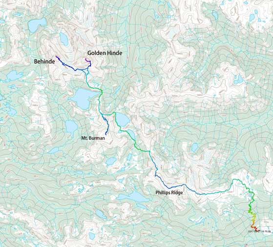In the end, successfully pulling off Golden Hinde, The Behinde, Mt. Burman and Phillips Ridge in a course of 3.5 days as my first trip onto the Vancouver Island was huge success. The ascent of Golden Hinde is more about backpacking and exploring the rugged island landscape than the classic mountaineering. There’s no aesthetic climbing on this (standard) SE Gully route other than perhaps the single pitch of 40-degree snow, but the vast variety of rugged terrain one travels through to get to just the base of this peak is something that one will never forget.