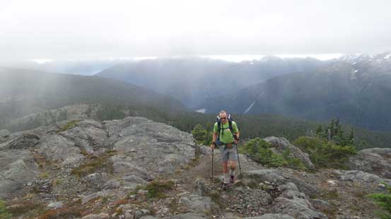 The next morning saw us waking up a bit later than planed but there’s no need to rush. The problem arose sooner than expected as a layer of low clouds rolled in and in no time we were in a complete white-out. There’s even some light drizzle which made lots of four-letter words flying around, mostly to curse the weather forecasters. But then we could see the ceiling layer was thin and there’s blue skies around so there’s little to worry about. The theme of up-and-downs had already started as soon as we got to the treeline zone of Phillips Ridge. I had lost count how many bumps we had to ascend up and over. The good thing we did not have to ascend the two highest bumps on Phillips Ridge’s alpine. To claim that summit we’d simply tag them on the return but right now let’s push as far as possible.