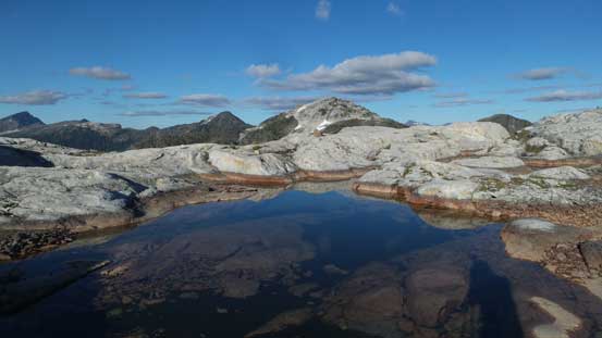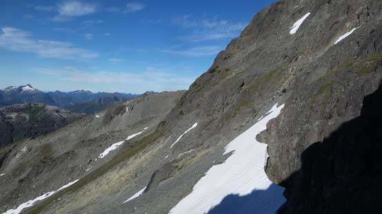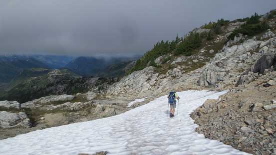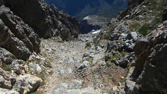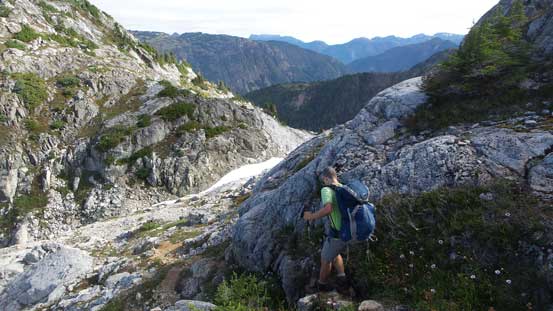 At this point Adam wanted to just head back to camp but I was still very keen on trying The Behinde so we departed from each other with me side-hilling across the entire lower south face, aiming for the distant Behinide/Golden Hinde saddle. The solo ascent of The Behinde turned out to be the scrambling highlight of this trip with sections up to 4th class and super exposed. A few hours later I was back at the “climber’s tarn”, picked up the trail and then descended into “Burman Chasm” at perhaps the most leisurely pace ever. The temperature and humidity was brutal on this day plus I was running low on water. Re-ascending out of the “Burman Chasm” back to camp felt like the most dreary 400-meter ever but at least the views were improving in the later afternoon sunbeams.