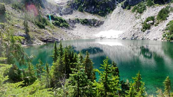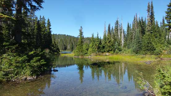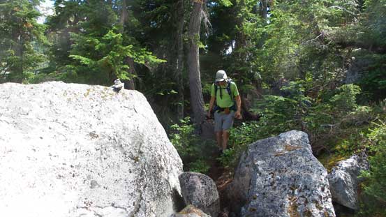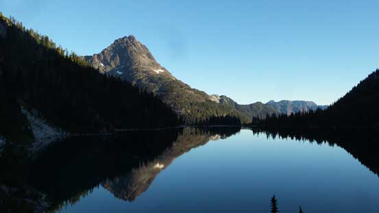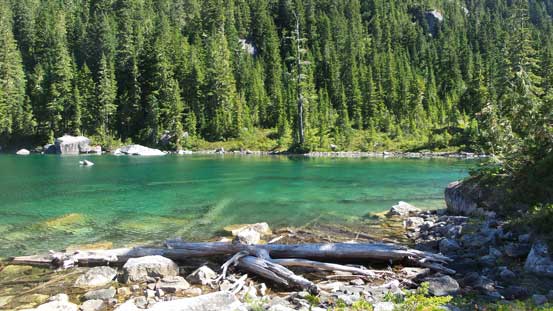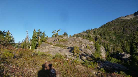 Back to camp I was totally beat but the good news, none of us was in the mood of moving camp. That meant we could have a pretty relaxed evening but then the 4th day would be a long death-march all the way back to the parking lot. The deal was made and then sleep came fairly easily although the temperature was still hot. The morning of Day 4 saw us departing at just after sunrise. Right off the bat we had to face that 300-meter descent to Schjelderup Lake which got our knees a good work out. And then there came the two consecutive unpleasant lake shore traverses, another 50 meters of plunge down Carter Lake’s outflow and then the 300-meter forested slog back to the 1350-meter saddle. Thank to the “alpine start” we had the pleasure to do this whole stage in the absence of sun beams.