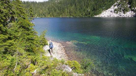 Towards the end of this Phillips Ridge traverse the ridge crest turned a more northwards direction and it was here that the terrain became super rugged. Right off the bat we lost the trail and then had to down-climb a 3rd class chimney. We rejoined the trail lower down and then did a long descent into a “waterfall chasm” before regaining all of the lost elevation back up to the next bump. And then three consecutive bumps followed in a sequence and it sure didn’t disappoint us, as we had to ascend up and over all of them and then drop down into a broad, 1350-meter saddle. Two routes split up here and the nowadays standard option descends the steep forest all the way to about 50 meters below the surface of Carter Lake. The only positive thing – there’s no bushwhack whatsoever thank to the popularity of this objective. The place where we crossed the outflow of Carter Lake was a good spot to take a long break and after that we carried on to the shoreline of Carter Lake where at least three tents were pitched.