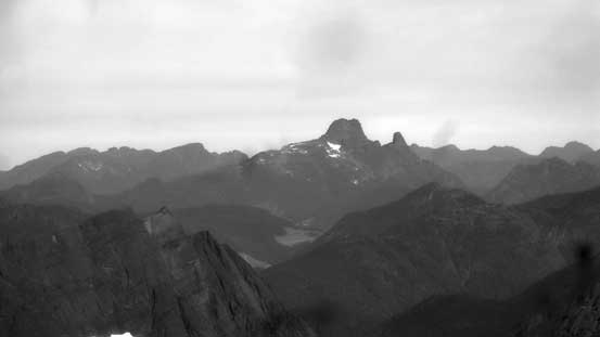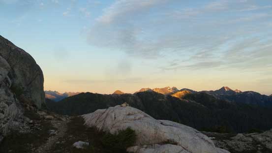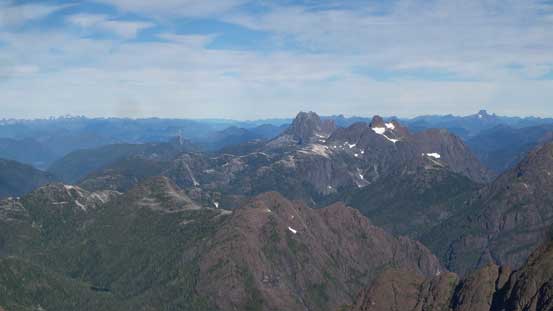 The pitch of snow was overall short-lived and then we were back onto rock. There’s nothing overly fancy in the upper gully although the ground was quite loose in general. The scrambling was however, “low 3rd class” at its hardest and before long we were at the top of this SE Gully looking down the north side. Then turning right following paths and cairns we had a leisure walk to the highest point. The scrambling was disappointing. The views were as expected, million-dollar towards each direction especially with the mighty Mt. Waddington visible on the skyline. About 40 minutes later the other group showed up and then it’s party time on the summit.