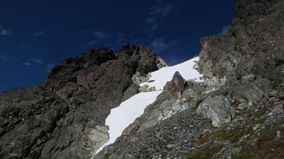 The gully was much easier than expected with scrambling difficulties not exceeding “low 3rd class” until we hit a (permanent) patch of steep snow. This pitch of snow was about 50 meters long and ran at 40-45 degrees ish at the steepest. Most parties including our reference trip report did a detour on climber’s right side. With good route-finding skills one can stay within “low class 4” terrain but as mountaineers we figured the easiest option was simply ascending the middle of this snow field. This snow climb looked tamely easy to me. I did take out the axe but didn’t bother to don crampons, but after 2/3 of the way up I regretted for not using the crampons. For the last 20 meters I had to kick multiple times as the snow was hardpacked and icy, and meanwhile the exposure was pretty real.