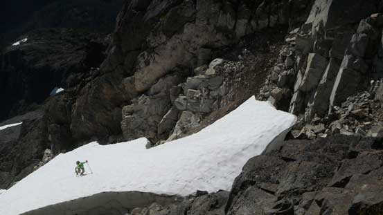 Eventually we had to go down. It’s hard to leave this summit but let’s face it. The plan was again, Adam and I descending roughly half an hour ahead of the other group so that the rockfall hazard was minimized. Reversing the loose gully was tamely easy as we could just (sort of) scree ski down the middle of the fall line. Back to the snow field, I didn’t fuck around with the gears this time, donned crampons and then down-climbed the entire path facing inwards. The snow surface was homogeneous which made a very enjoyable process. Only a few kicks got me into the rhythm I wanted. Adam played more cautiously but joined me soon afterwards. The gear transition took a couple more minutes and then the next thing we were down to the bottom of this SE Gully, and then easily reversed the lower SE Face. To locate the lower couloir I pulled the GPS out because we descended too low and missed the path.