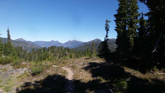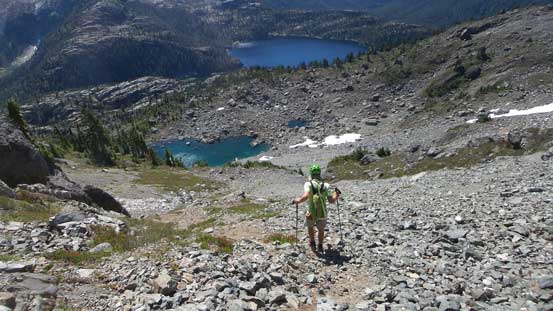 Just when I thought the constant up-and-downs were (briefly) over we made the decision to ascend both highpoints of Phillips Ridge just to be sure we actually made its summit. The first summit was just a short detour from the trail so not a huge deal, but the second summit required an extra 100+ meters of elevation gain to reach. The view from the second summit was good so I’m happy about this decision overall. Now what?! In the height of afternoon heat with temperature probably exceeding 30 degrees Celsius we had to resume the death march. The lower reach of Phillips Ridge traverse involved more up-and-downs with “downs” more than “ups” of course. The combined physical challenges of this trip had finally taken its toll on me. By rough estimate we had gained more than 6000 vertical meters of elevation in the last three days and now we still had to face another 1000+ meters of descent to the parking lot. Needless to say, the last few hours of descent to, and then from Arnica Lake was the most miserable slog ever.