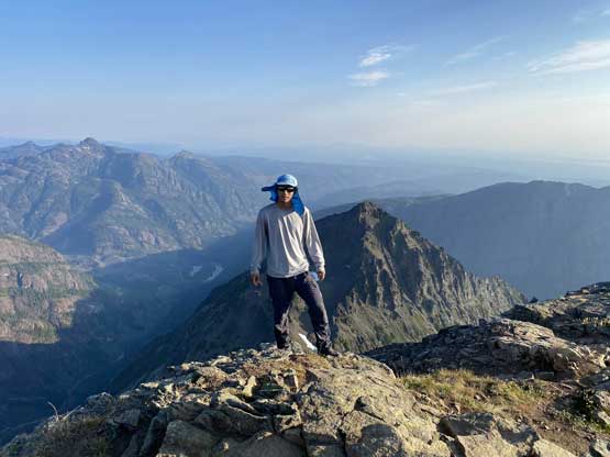 We debated about where exactly to camp as we did not come here with a precise plan and it wasn’t very obvious where would be the best spot. We still had a few hours of daylight to kill so the decision was to carry onward towards Mt. Albert Edward and decide spontaneously. I was more interested in just camping at the col but reluctantly agreed to push further. In the end we did not find that “perfect spot” but the site we found wasn’t bad. We were able to pitch out both tents on a massive rock slab (albeit a little slanted), and found a tiny stream of running water under a large patch of snow, albeit with about 5 minutes of walking. The sunset scenery we got from this campsite was insanely good, partially thank to the lightly hazed horizon.