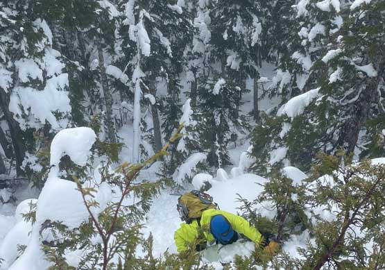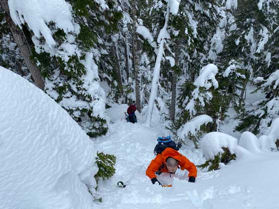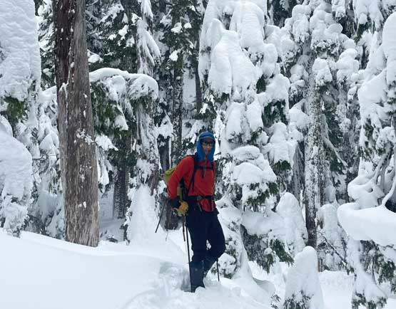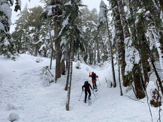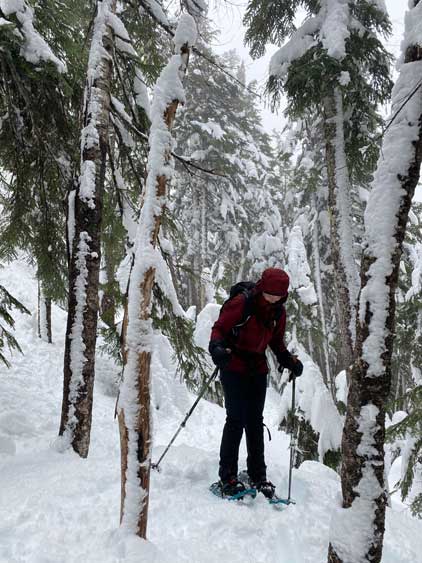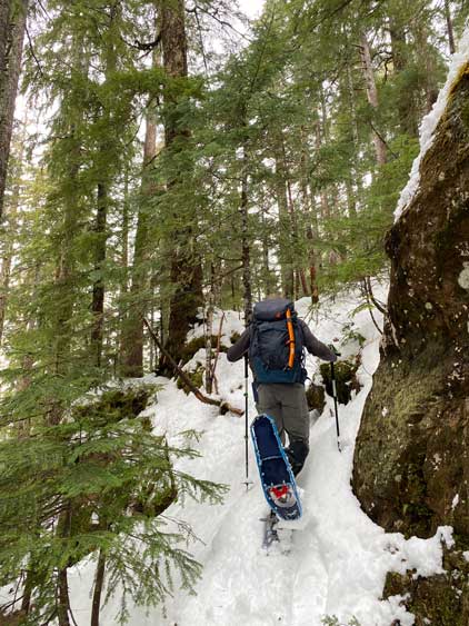 The first stage was as simple as plodding the snow-covered spur roads to the very end. Raphael as usual, led a blistering pace right from the start and a kilometer or two later we had to don snowshoes. Another short while later Samir decided to turn around to have a leisure day whereas Raphael, Mackenzie and I continued. The trail-breaking started to become heavy. From the end of the spur roads I led us ascending a not-so-pleasant cut-block into the mature forest. There was some bushwhacking but nothing worth noting. We ascended a NW-facing rib and towards the end of this micro-section we encountered flagging and what seemed like a snow-covered trail. I recalled that Nikita had sent me an AllTrails page about this peak. At the time I didn’t even bother to read because I’m not a fan of AllTrails and I already had my own route planned. Little did I know that my way was pretty much the same as that trail. For the next while we basically just followed the flags upwards, breaking our own trail on top of the summer trail.