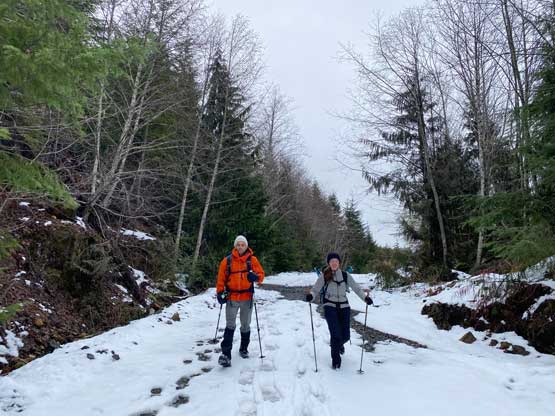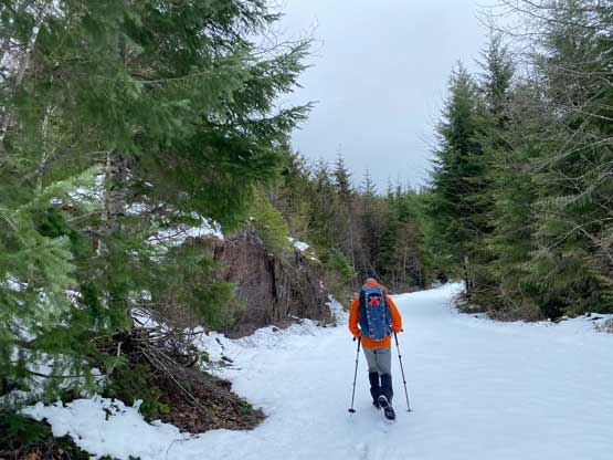 As usual a day-trip to Vancouver Island would involve two times more logistics than hiking and this trip wasn’t an exception. I woke up at 4 am from White Rock, firstly went to swap vehicle with my parents in North Surrey and then picked the three of them up in North Vancouver. We then lined up at the ferry terminal and took the sub-2-hour ride to Nanaimo. The drive on the other side was about 2 hours so we didn’t start hiking until 10 am, 6 hours after I woke my tired self up. The FSR (Gracie Main) had some snow at Gracie Lake (400 m) whereas the spur road on the west slopes of Mt. Anderson was completely covered. We were able to drive a short ways up the spur road following a set of tire tracks, but turned around and parked as soon as the tire tracks disappeared. That was at 450 m elevation.