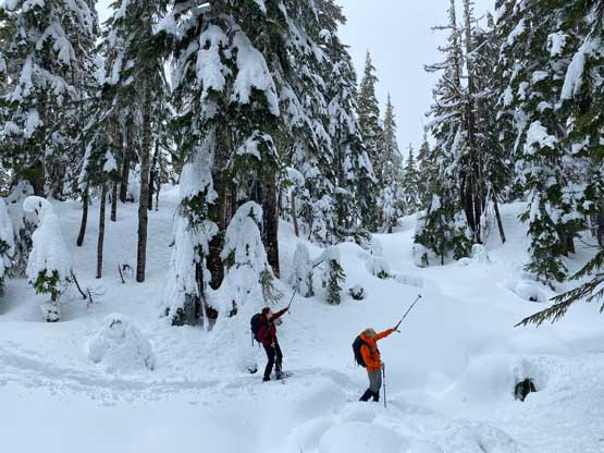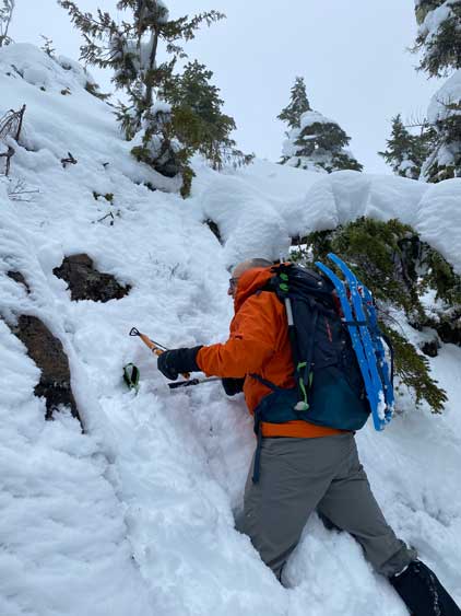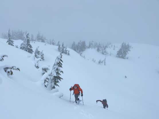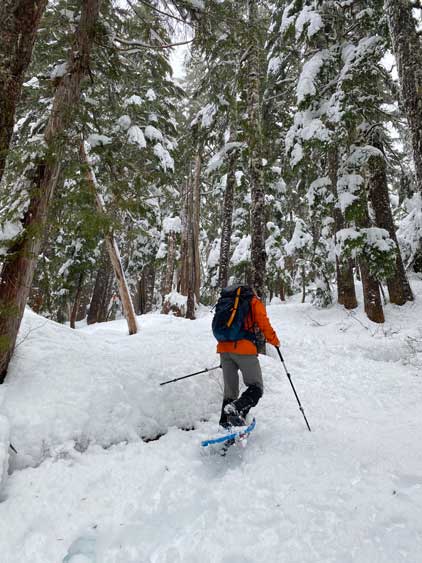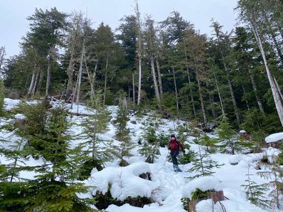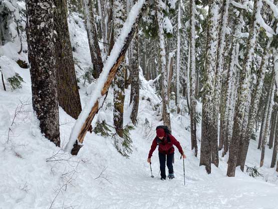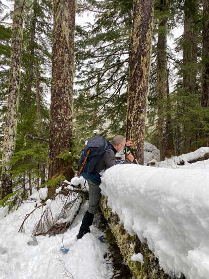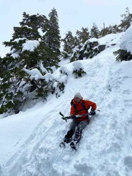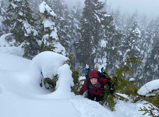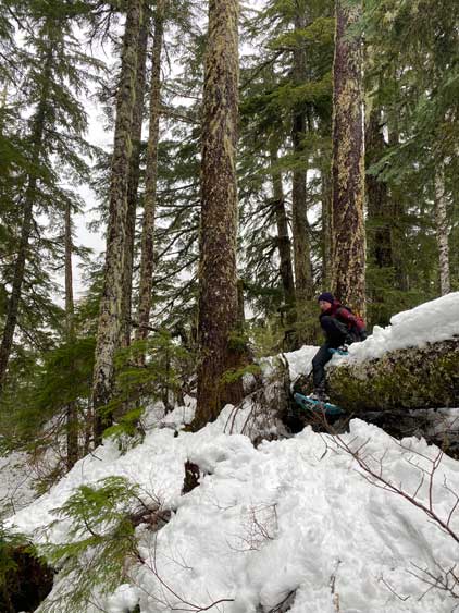 Near 1100 m elevation the trees started to thin and the snow depth increased drastically. We were post-holing in the classic west coast cement but we still made steady progress. There’s a bluff with no obvious bypass from where we were standing. I’m sure by contouring to the south we could find an easier way but I wanted us to practice snow climbing. I spotted a line that should work so we swapped the snowshoes for ice axes. I didn’t bring an ice axe so I would just use my fists and fingers to hold onto the snow. There was more wallowing than climbing, unfortunately. The steep snow passage gave way to a short 3rd class step with some vege belays. Raphael volunteered to lead the rock crux, cleaning off the loose snow with the adze of the ice tool like a real alpinist. After this bits of excitement we strapped the snowshoes back on and plodded across the rolling terrain to the true summit, now completely in flat light inside a ping pong ball. There was no view to speak of whatsoever and the visibility was down to 10 meters. The saturated white-outs reminded me the Hawaiian jungle a few days earlier.