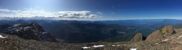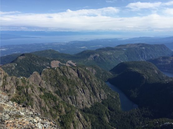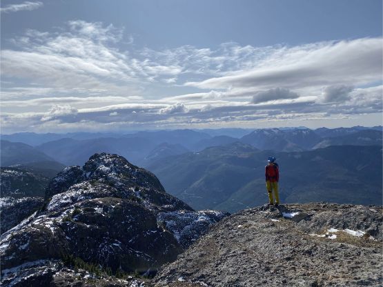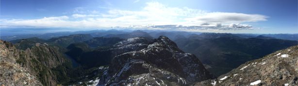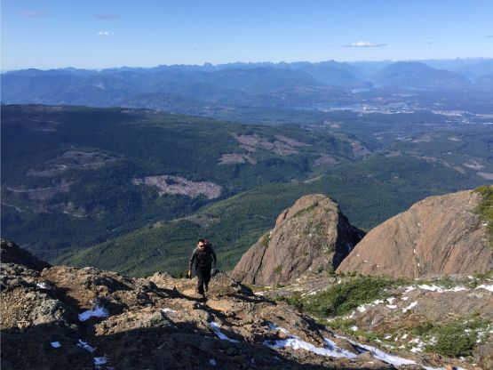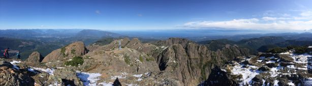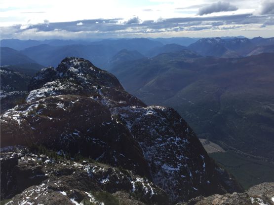 It didn’t take us long to reach the plateau/saddle NW of the true summit. From there the view fully opened up. While being busy taking photos we easily scrambled the final 50 meters to the true summit. The last bits involved a bit of 3rd class scrambling because we didn’t find the easiest line, which was hidden behind a gully filled in with new snow. The summit was gorgeous but windy and cold, so we only stayed there for about half an hour. The ascent took us about 1 hours 40 minutes only but with Mt. Benson also in the plan we actually didn’t have that much extra time to kill.